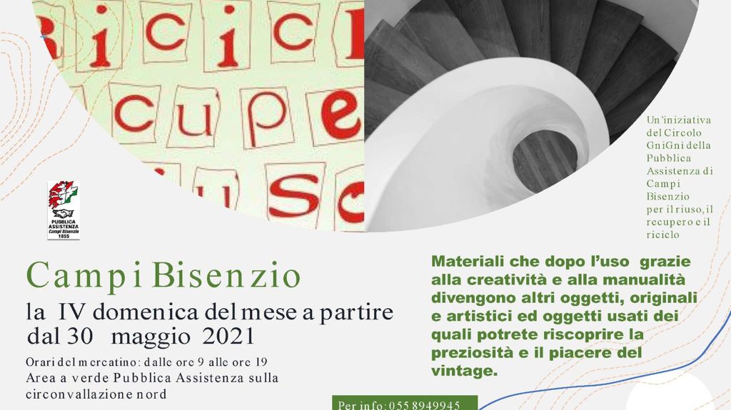 Il 30 maggio 2021 è ripartito il mercatino del riuso e del riciclo organizzato dal Circolo Gni Gni presso lo spazio all’aperto della Pubblica Assistenza di Campi Bisenzio. Il mercatino si svolgerà la IV domenica di ogni mese con orario 9.00 – 19.00. per info:  055 8949945