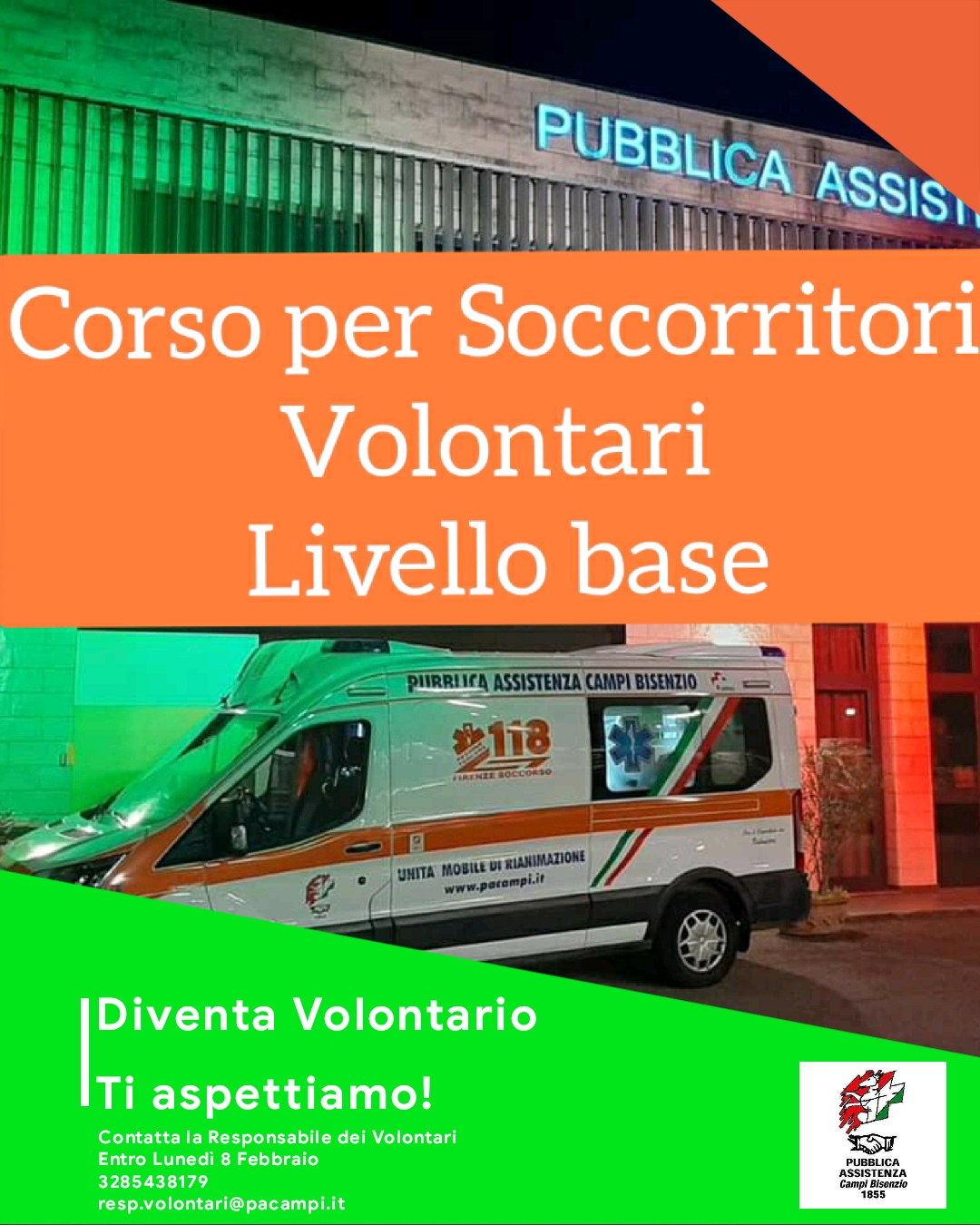 Presso la sede della Pubblica Assistenza di Campi Bisenzio si svolgerà un nuovo CORSO PER SOCCORRITORE SANITARIO LIVELLO BASE. Le iscrizioni sono aperte, il corso inizierà MARTEDI’ 15 febbraio alle ore 21. Per iscriversi è necessario: Inviare una mail a resp.volontari@pacampi.it oppure telefonare a Zanobetti Paola, Resp dei Volontari, al 3456816618 Vi aspettiamo numerosi