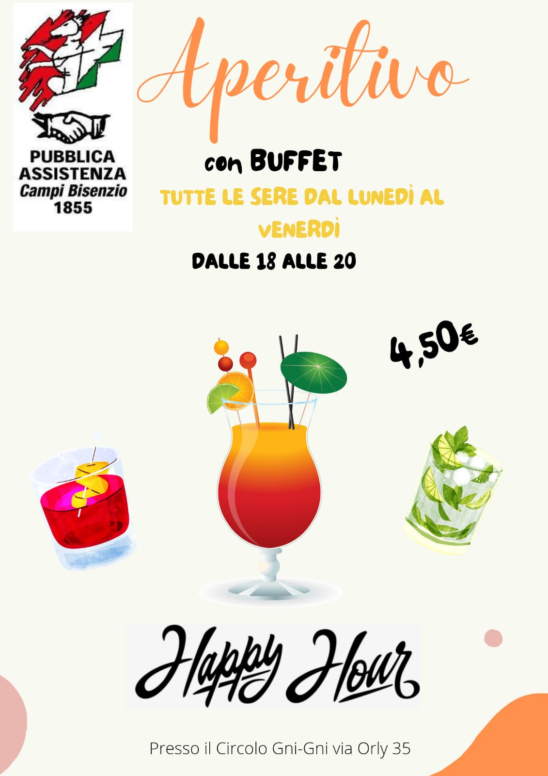 Al CIRCOLO GNI-GNI della Pubblica Assistenza in via Orly 35 a Campi Bisenzio inizia l’HAPPY HOUR. Dalle 18 alle 20 dei giorni feriali (lunedì – venerdì) è possibile sorseggiare magnifici aperitivi e gustare squisiti stuzzichini alla modica cifra di 4,50 euro. Un momento di fresco relax nelle serate più calde dell’estate.
