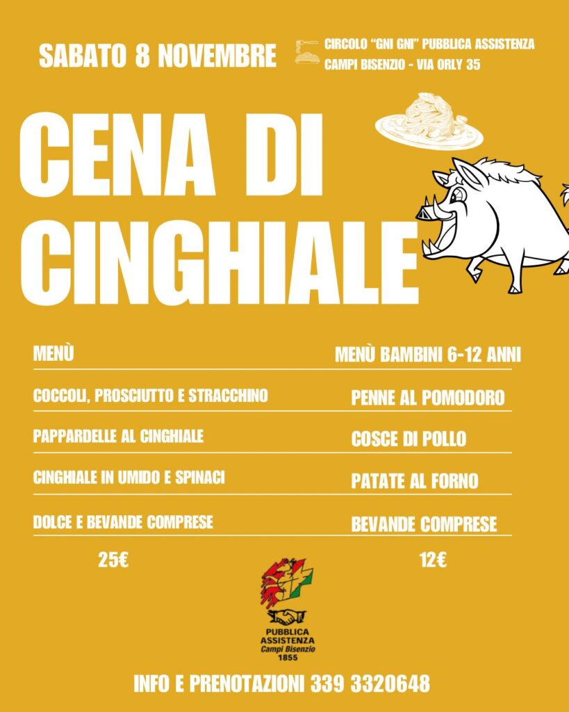 Sabato 08 novembre alle ore 20.00 al Circolo della Pubblica assistenza di Campi Bisenzio CENA A BASE DI CINGHIALE alla modica cifra di 25 Euro.